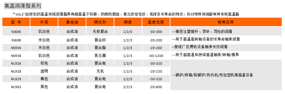 “VISLE”自研發(fā)的高溫領域潤滑脂具有耐高溫不積碳、防銹防腐蝕、氧化安定性好、低揮發(fā)長壽命的特點,針對特殊領域都有其專用高溫脂
